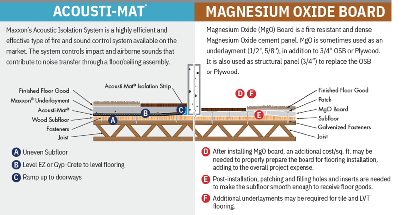 Recently, composite board and magnesium oxide (MgO) board products have been marketed as an alternate underlayment solution for multifamily properties. As the leader in fire-safety and sound control for multifamily construction, Maxxon is committed to advancing the industry, not only through innovation, but education as well. As you evaluate specification options, it can be helpful to examine how different systems approach fire performance and acoustic control. Comparing these approaches alongside established, proven solutions and asking a few key questions along the way can help ensure the selected assembly aligns with both design intent and real-world performance expectations.