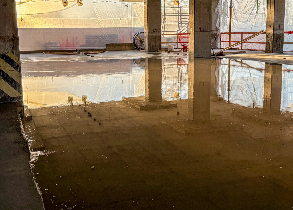 The slopes were ranging from low spots requiring fill depths of up to 5 inches to high spots that needed grinding up to 1 ¾ inches. The General Contractor, Robins & Morton, faced the dilemma of either demolishing and repouring the entire 19,000 sq. ft. parking deck, or finding a lightweight, rapid, and structurally viable alternative.