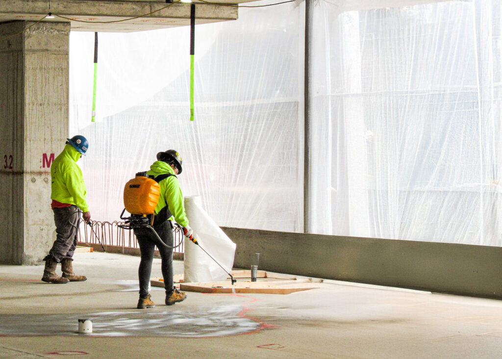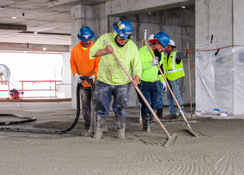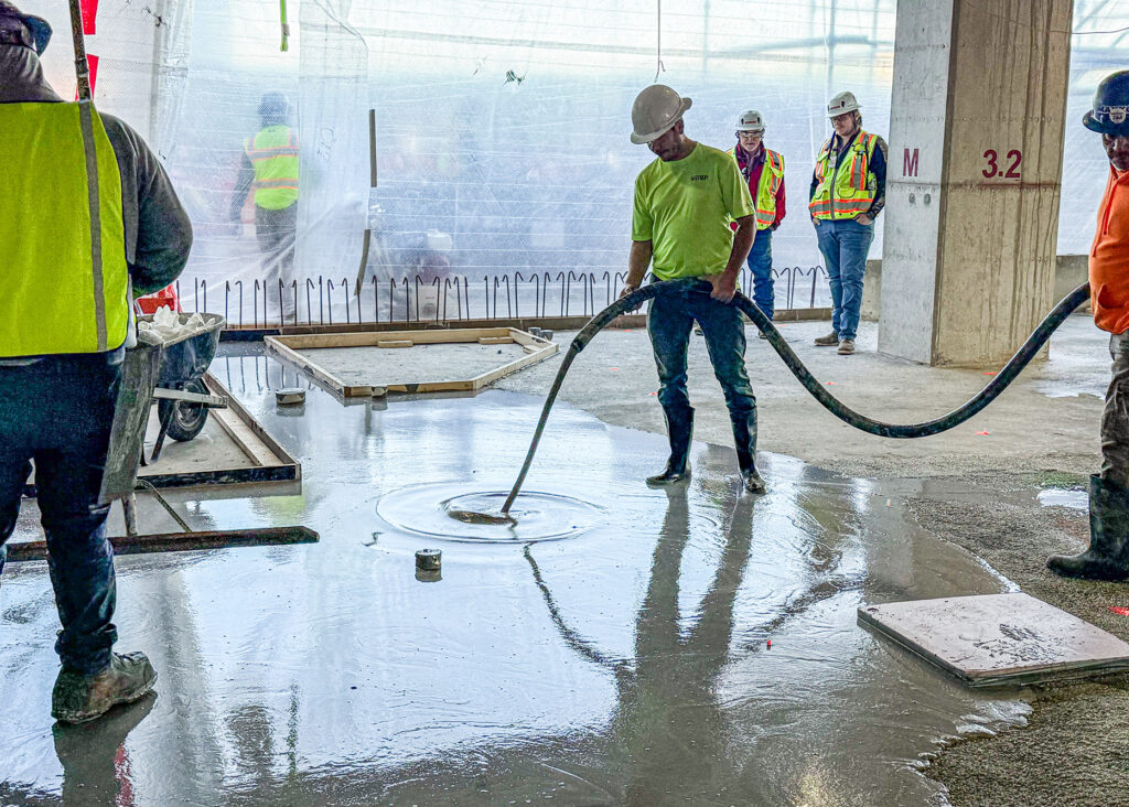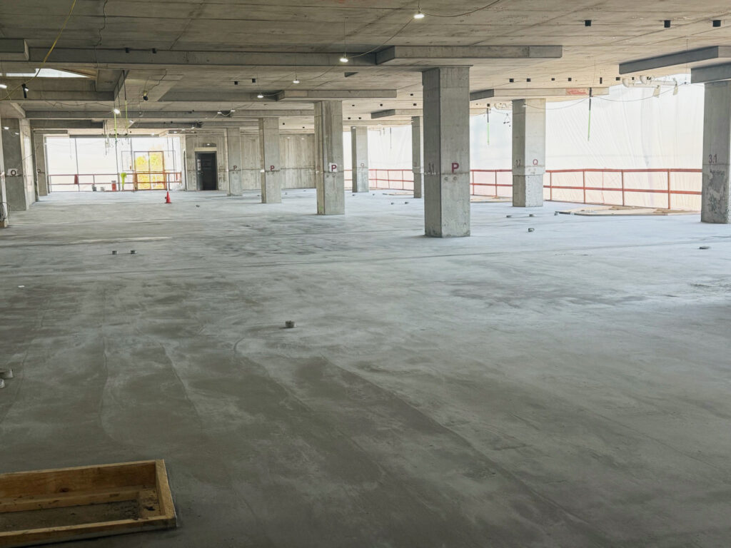 The Madison Street Tower Expansion involved a significant adaptive reuse project: adding five new stories of patient care space (120 beds, cardiothoracic, and neuro ICUs) atop an existing four-story hospital parking garage. The most critical challenge was transforming the existing 4th-floor parking deck—which was intentionally sloped dramatically for drainage—into a perfectly level subfloor to match the adjacent hospital’s 4th-floor elevation and meet the tight flatness tolerances required for advanced patient care facilities.